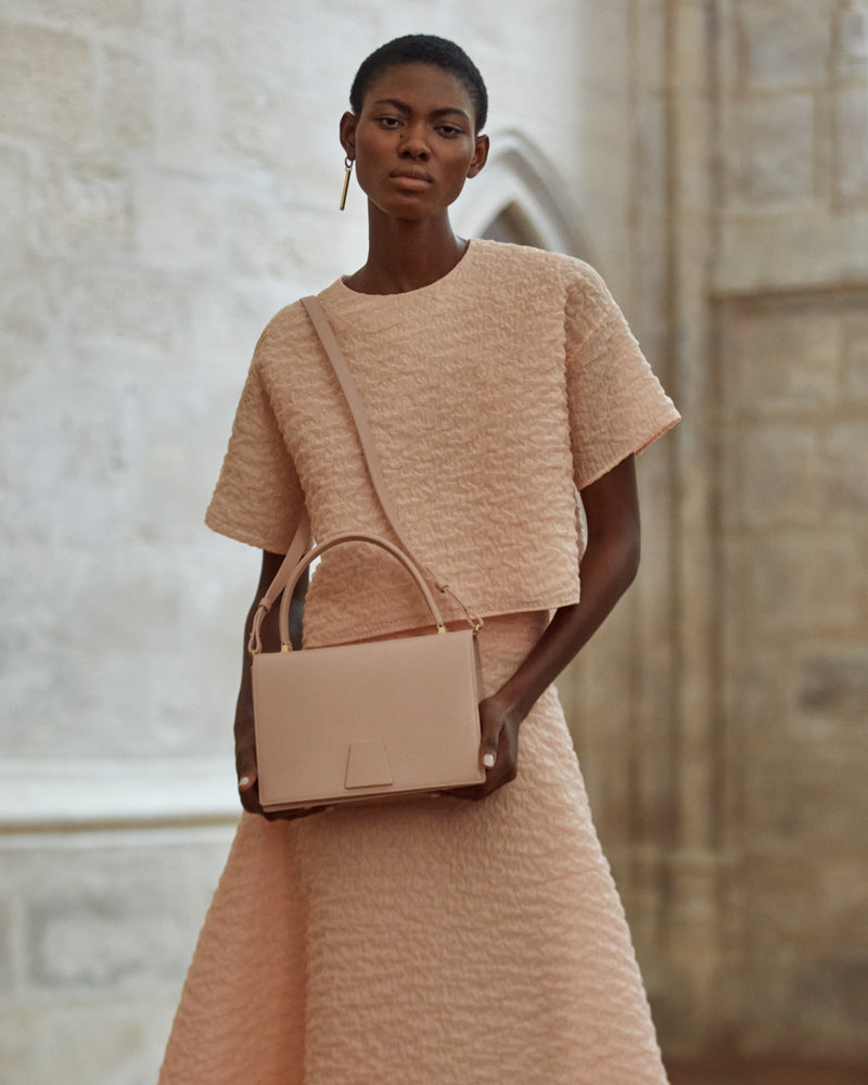 シンプルでピュアなラインの「Akris Alice(アクリス アリス)」は、アクリスの創業者であり現クリエイティブ ディレクターであるアルベルト・クリームラーの祖母、アリス・クリームラー=ショッホにちなんで名付けられました。アクリス初のトップハンドルバッグで、アルベルトの建築的な思考を反映した、構築的でありながらエレガントなフォルムが特徴です。