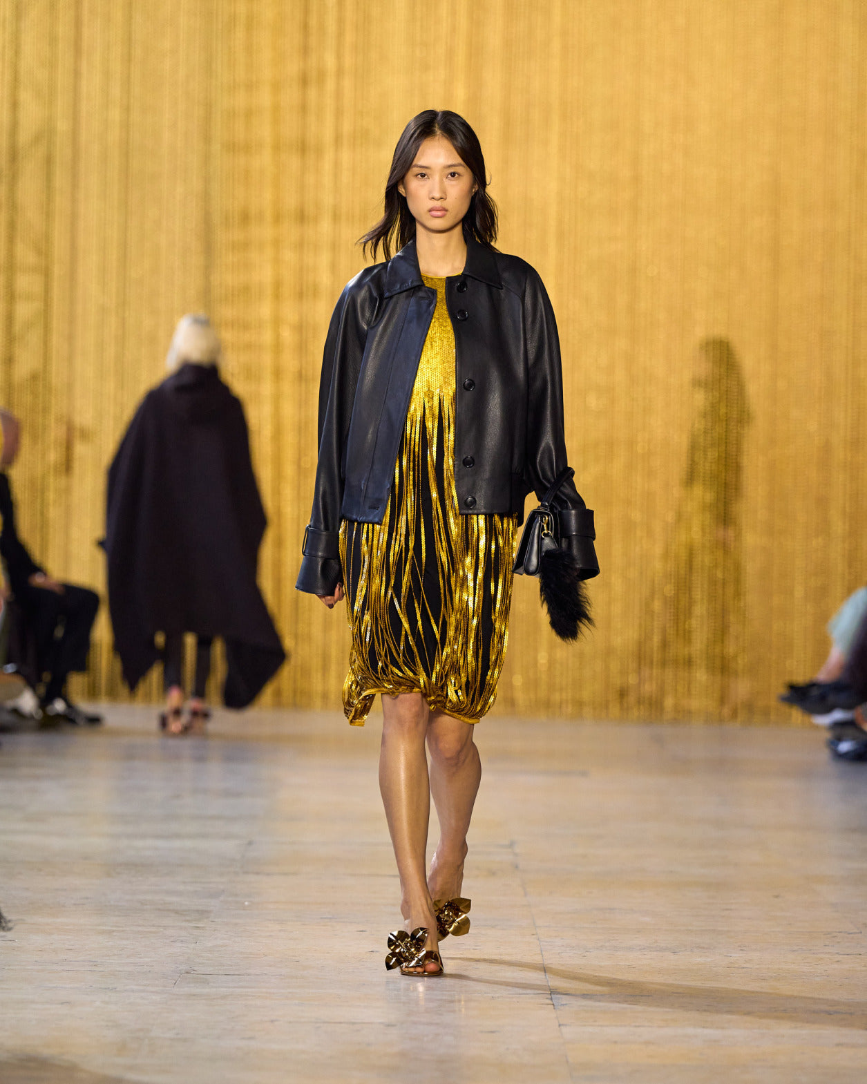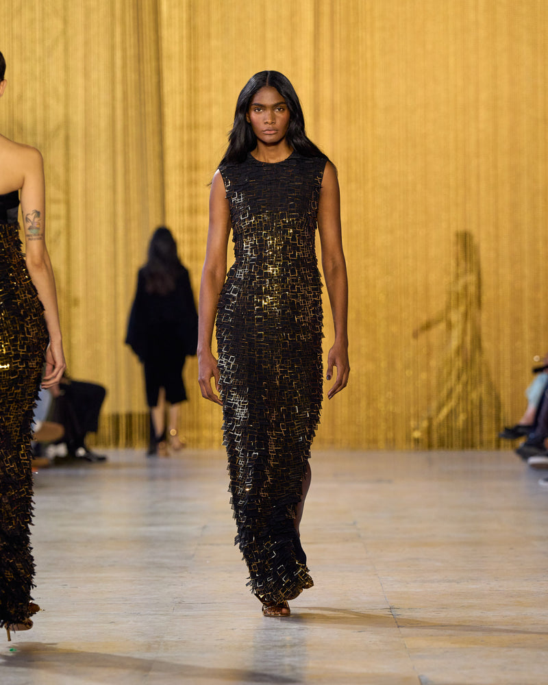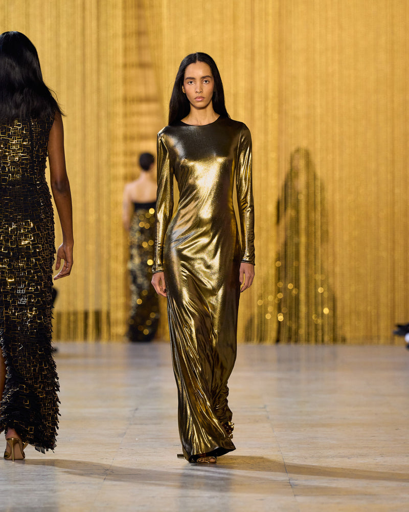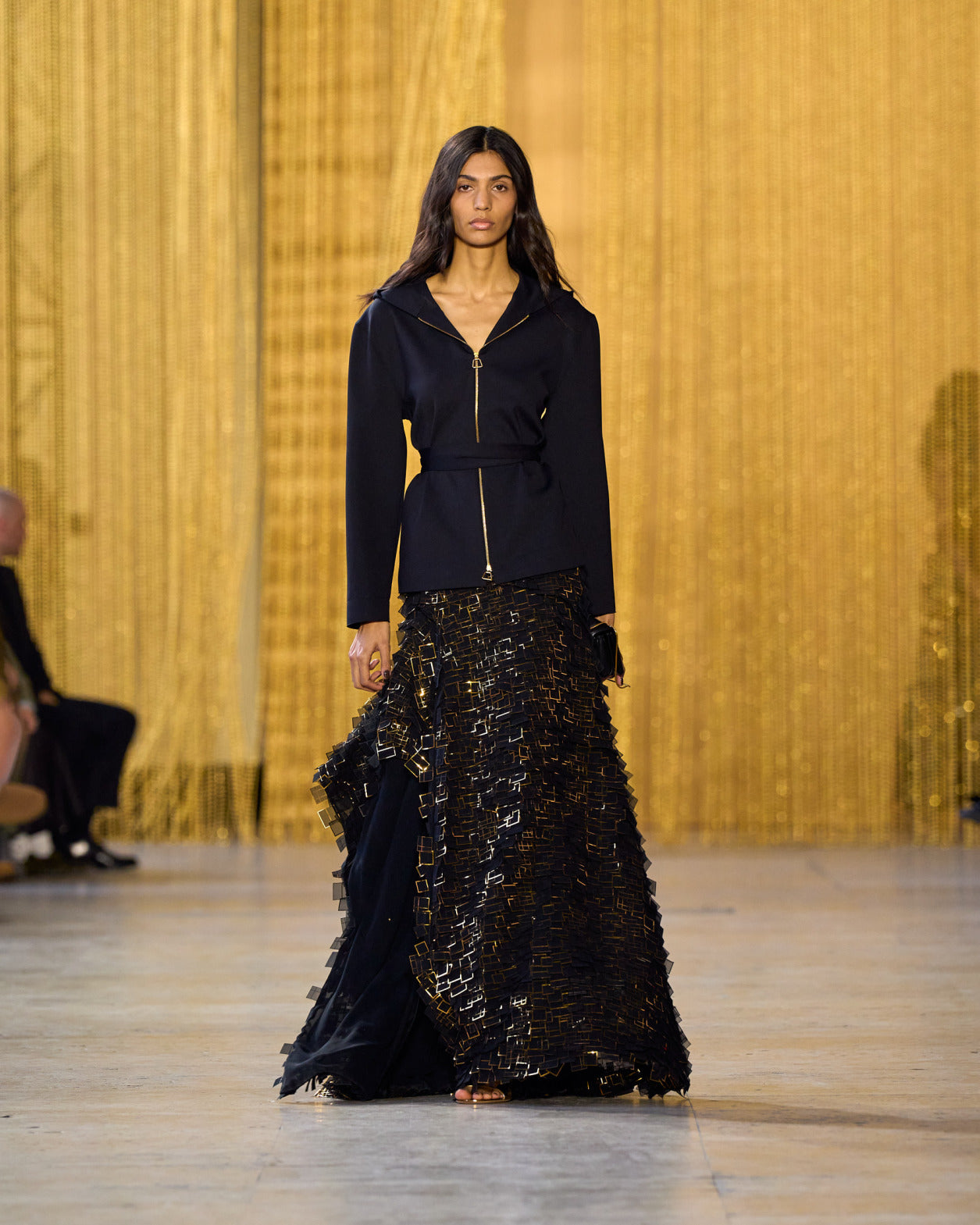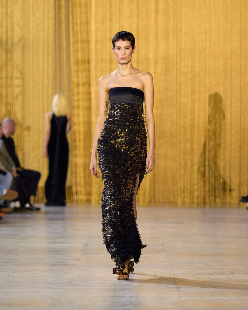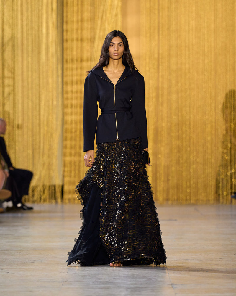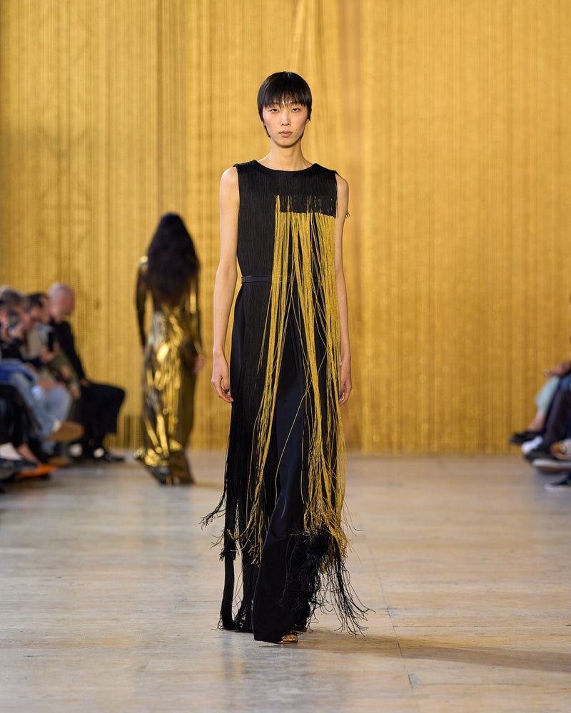 ショーはパリ「パレ・ド・トーキョー」で開催。会場内では、きらめく黄金のカーテンが空間を引き締め、モデルがランウェイにランウェイに足を踏み出すたびに微かに揺れました。