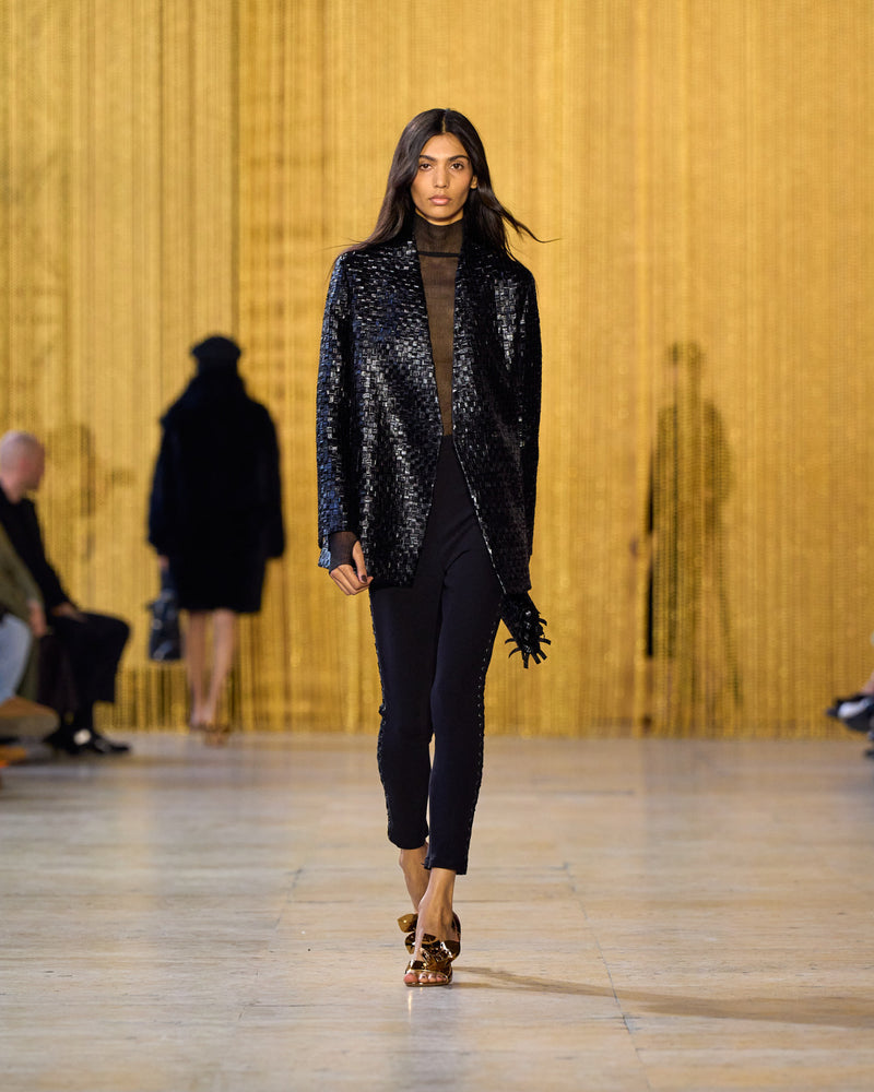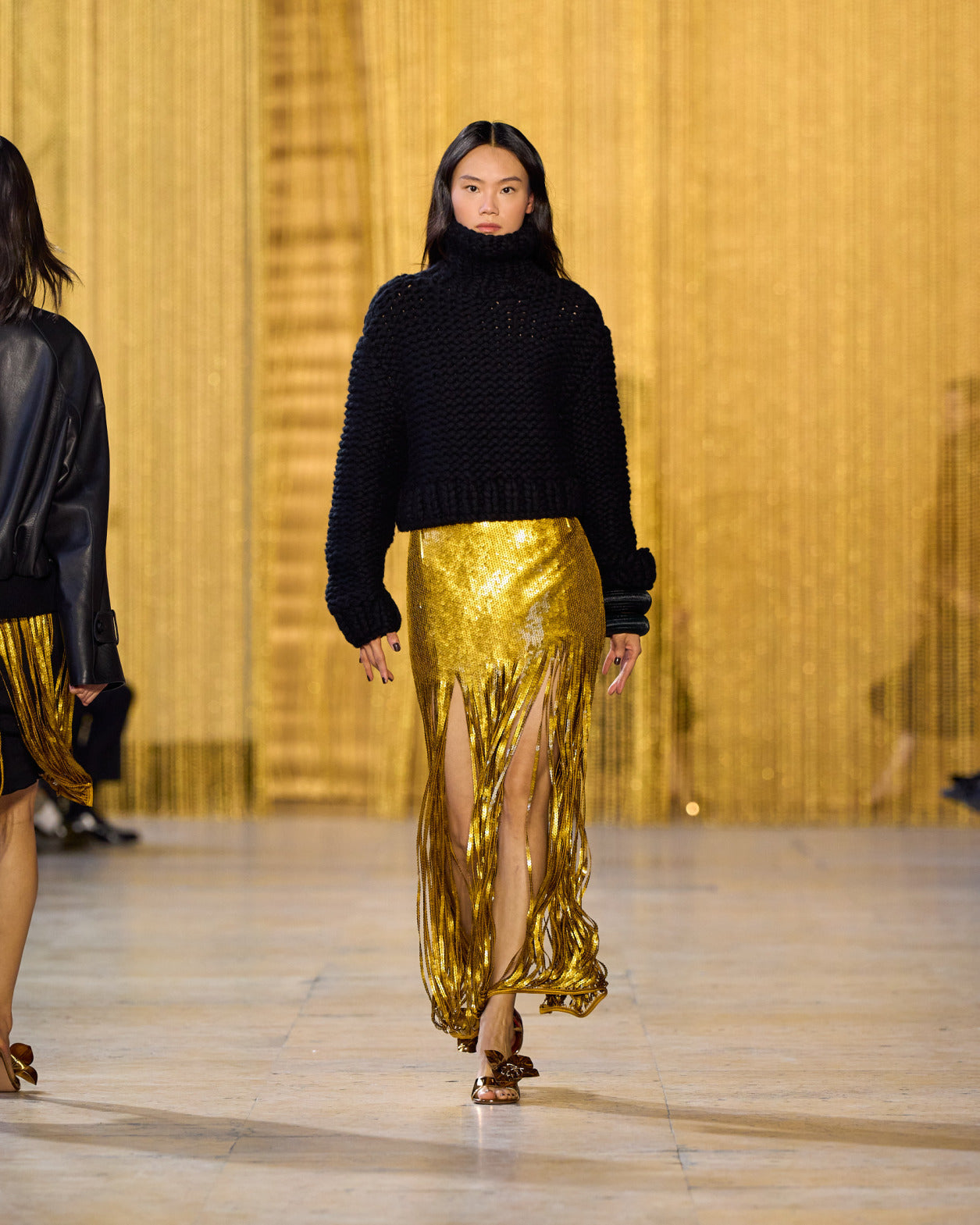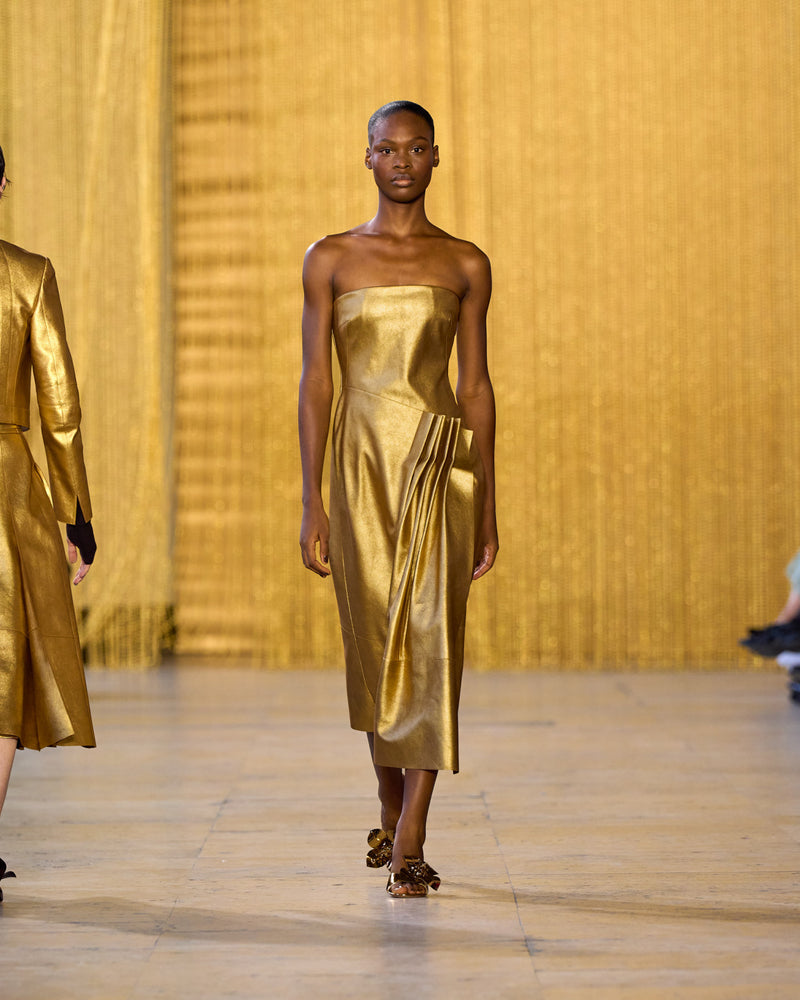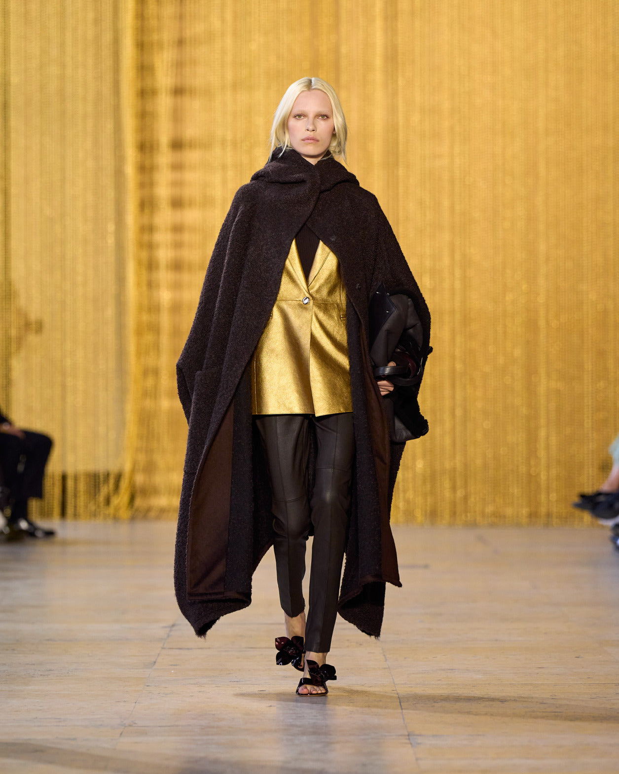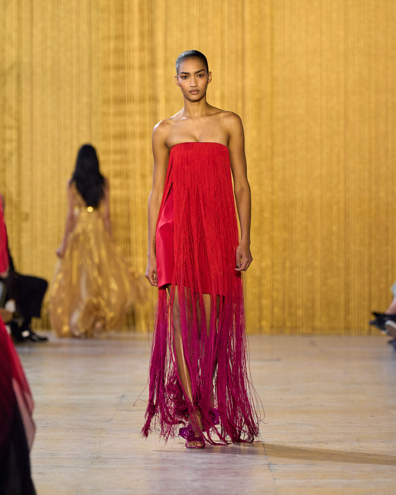 ショーはパリ「パレ・ド・トーキョー」で開催。会場内では、きらめく黄金のカーテンが空間を引き締め、モデルがランウェイにランウェイに足を踏み出すたびに微かに揺れました。