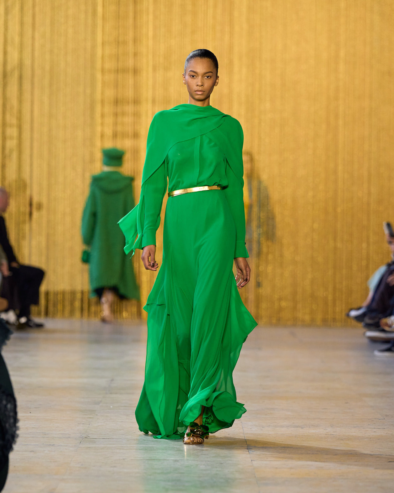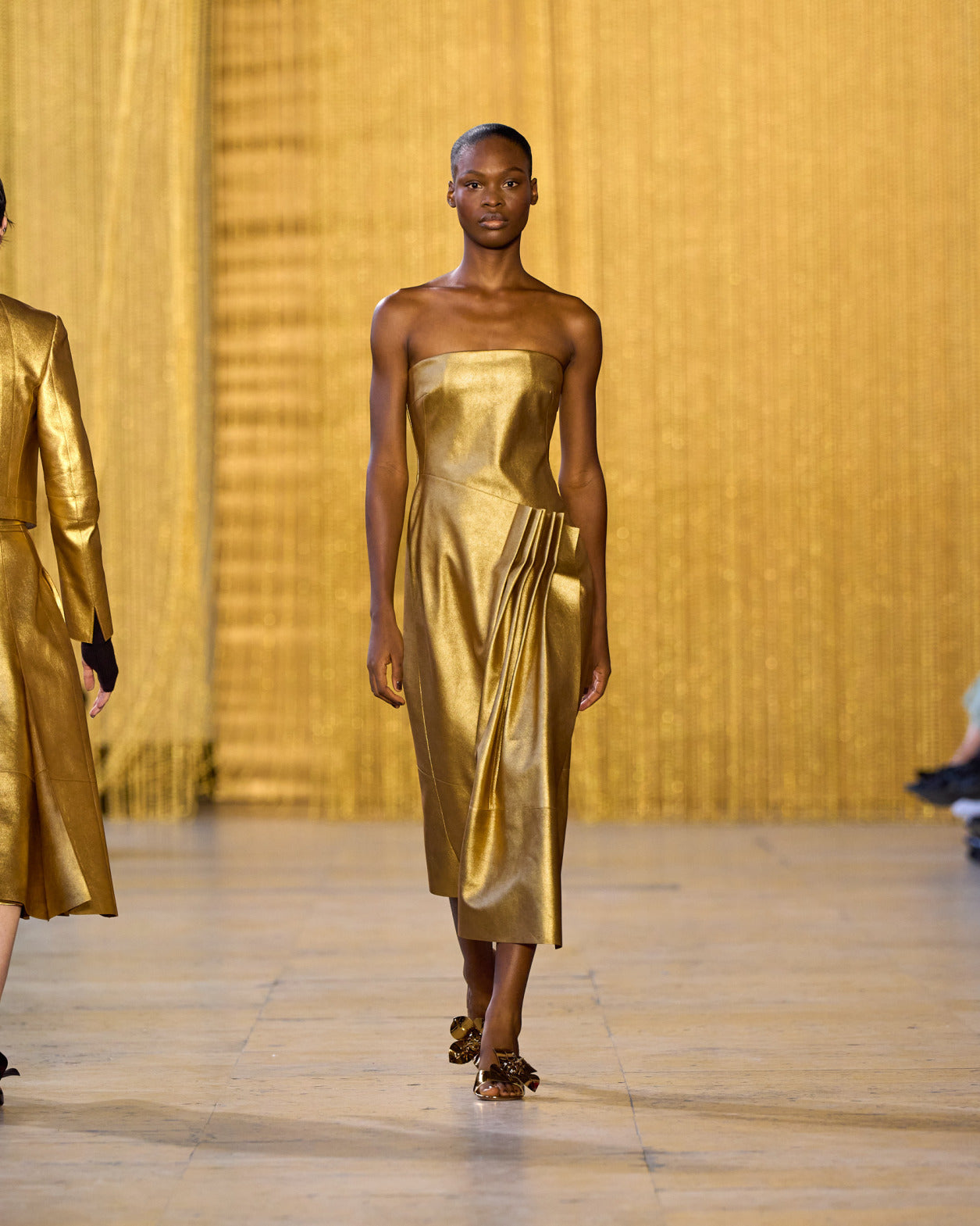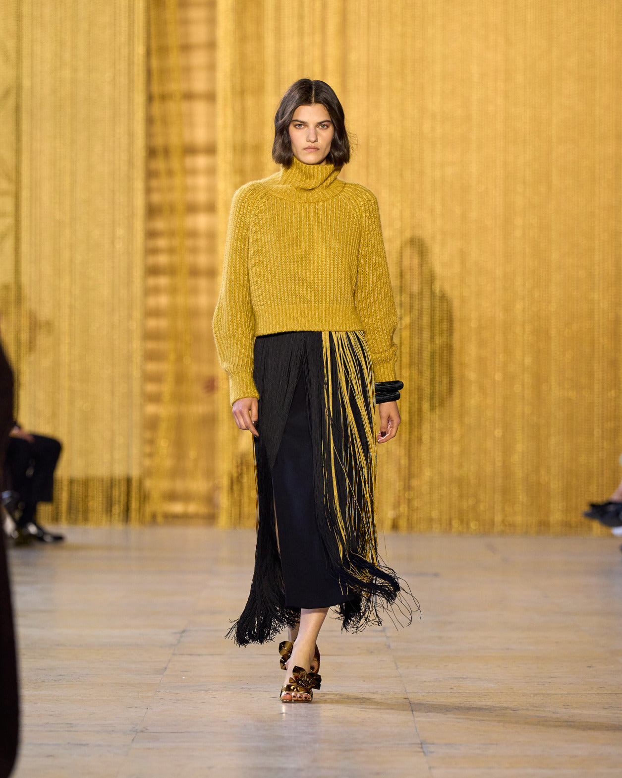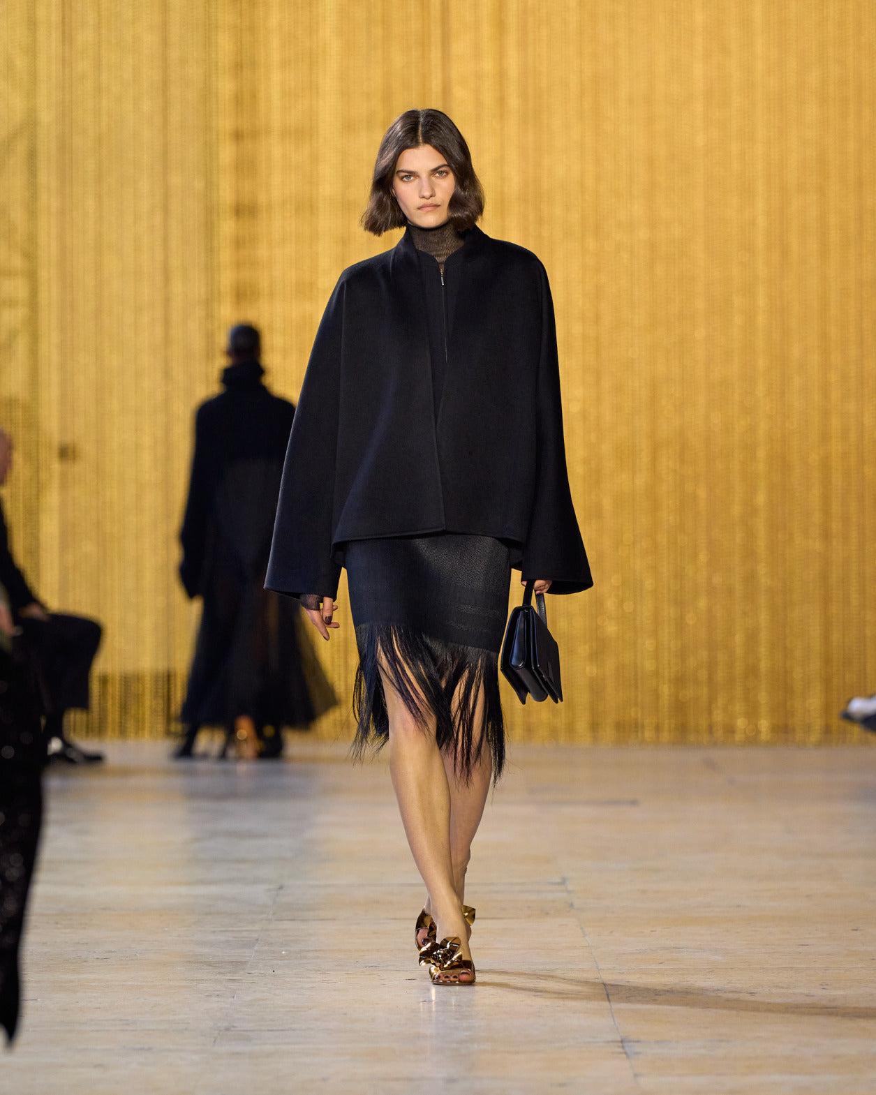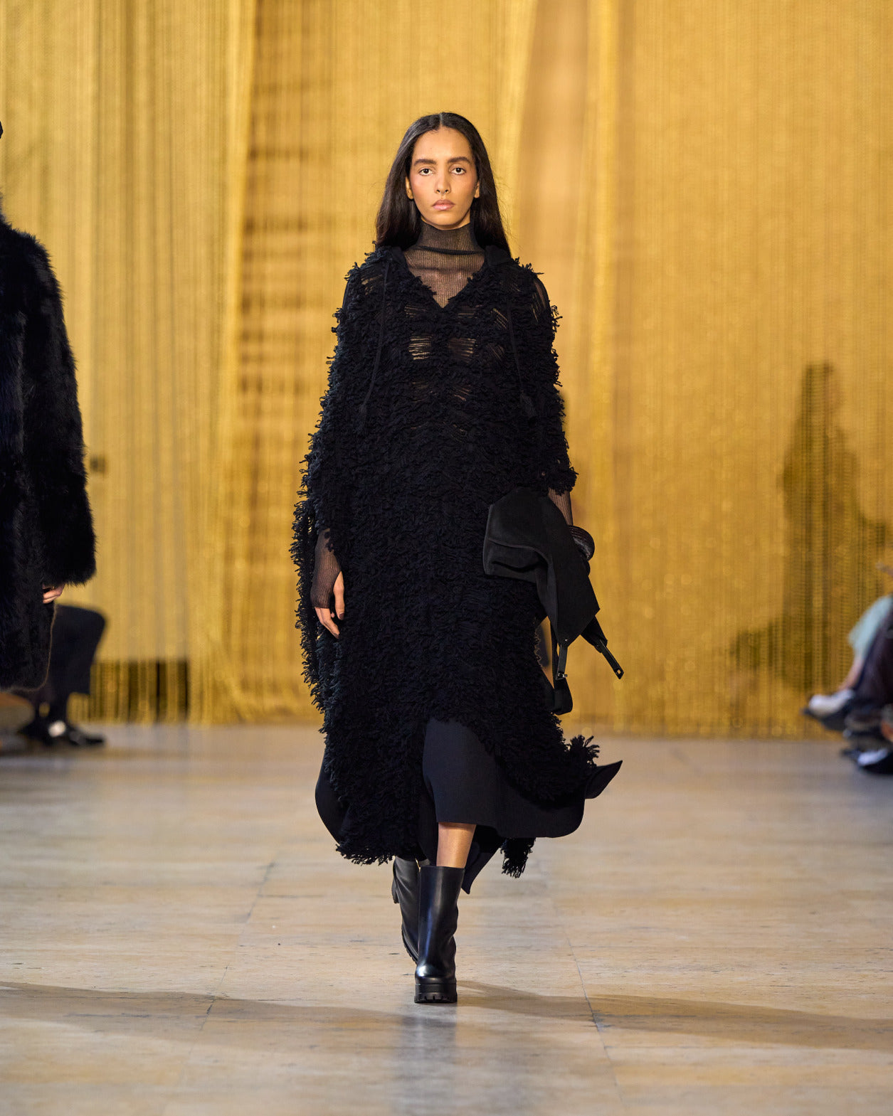 ショーはパリ「パレ・ド・トーキョー」で開催。会場内では、きらめく黄金のカーテンが空間を引き締め、モデルがランウェイにランウェイに足を踏み出すたびに微かに揺れました。