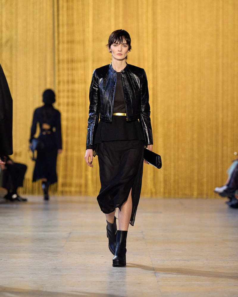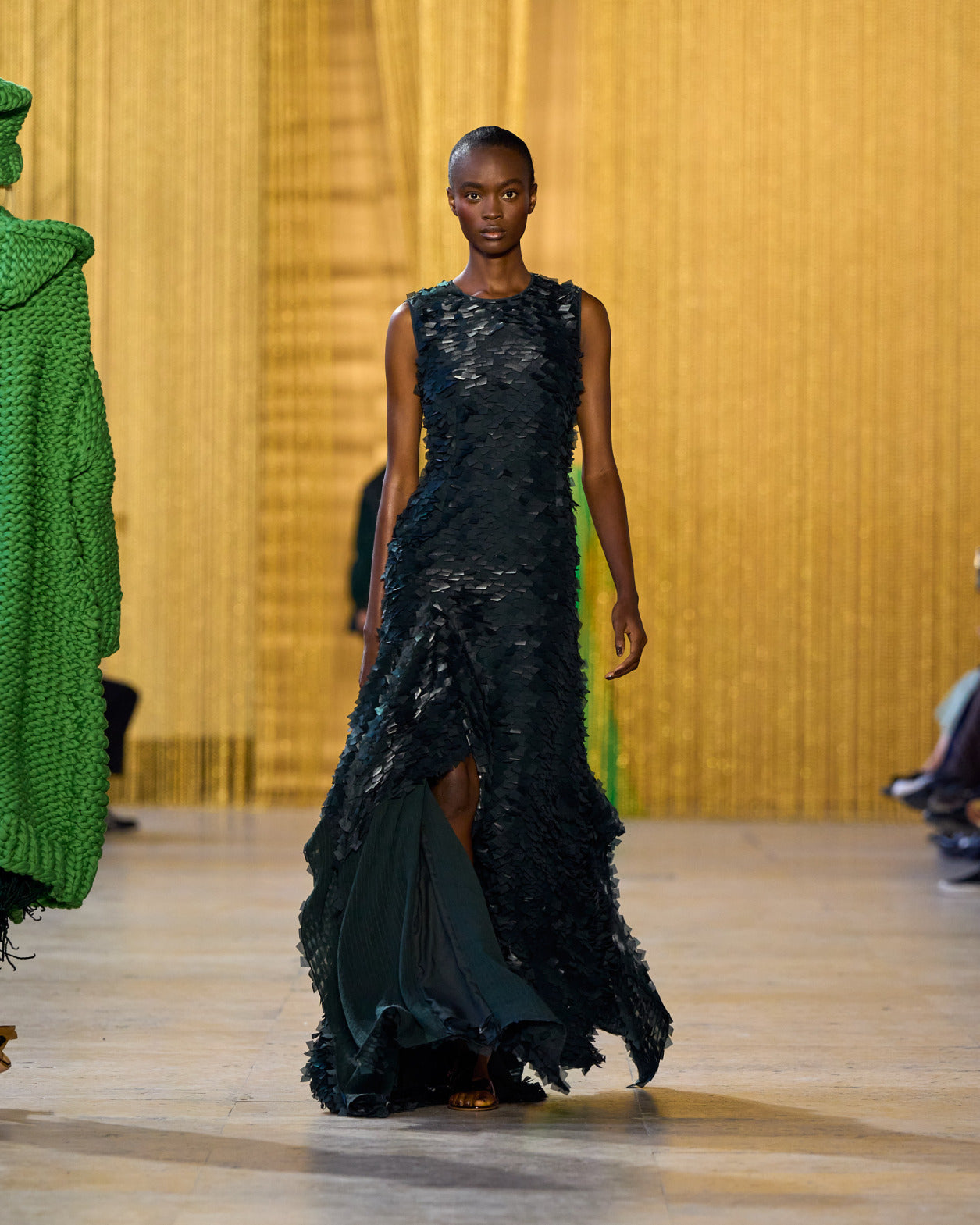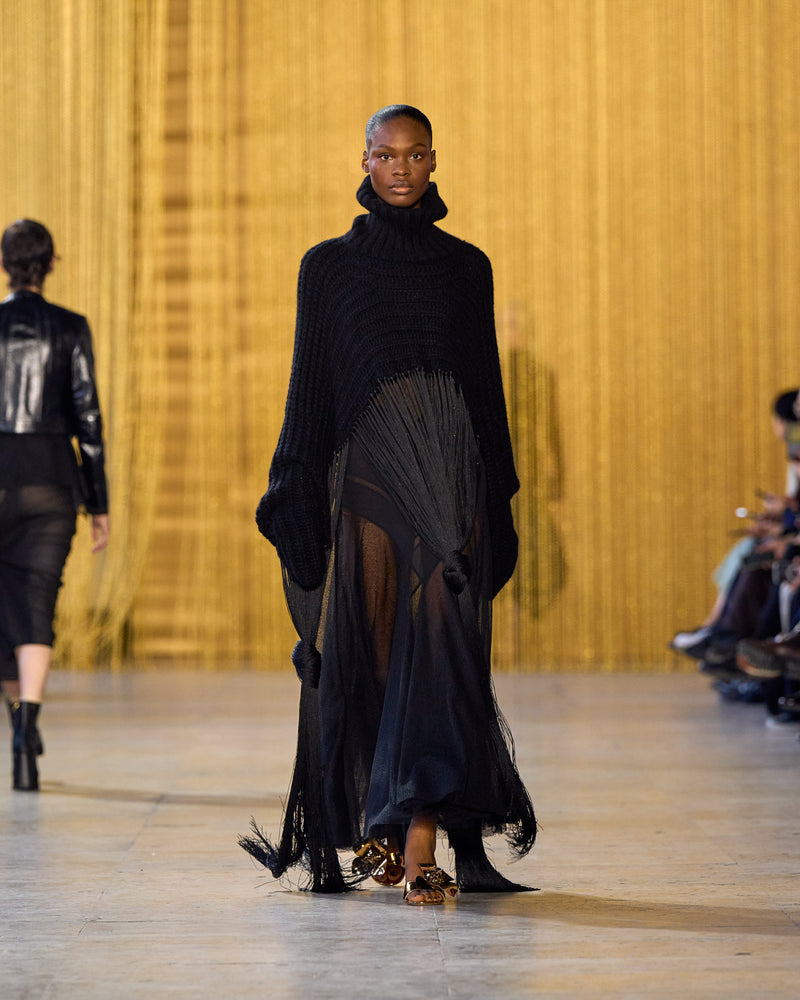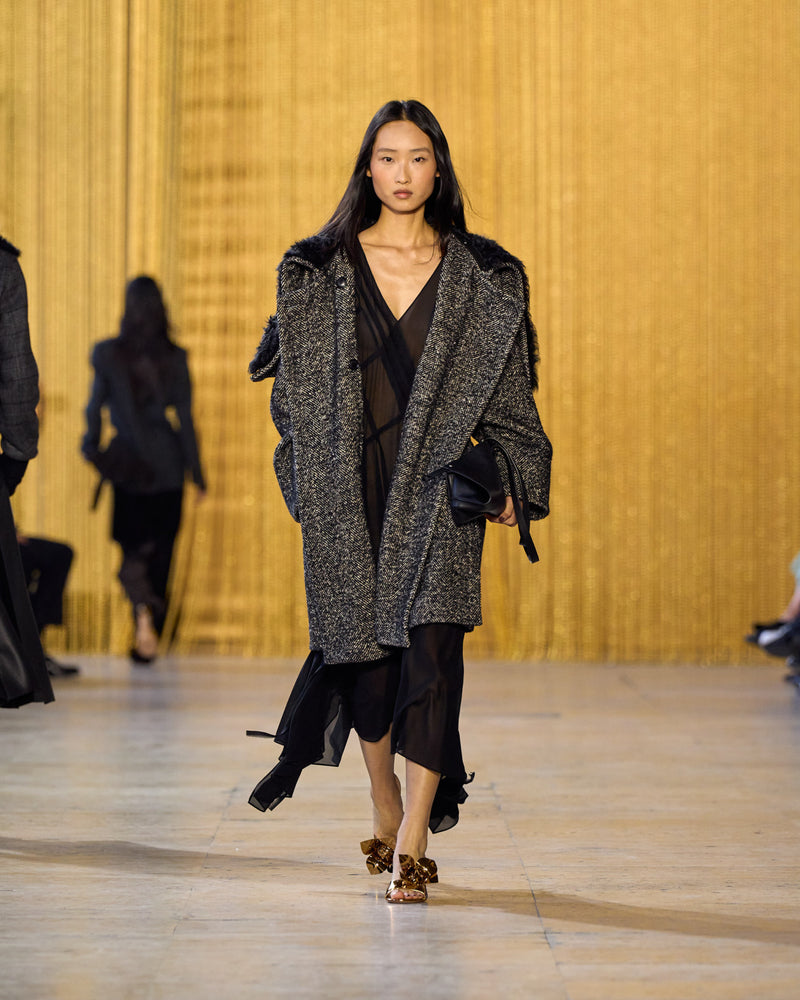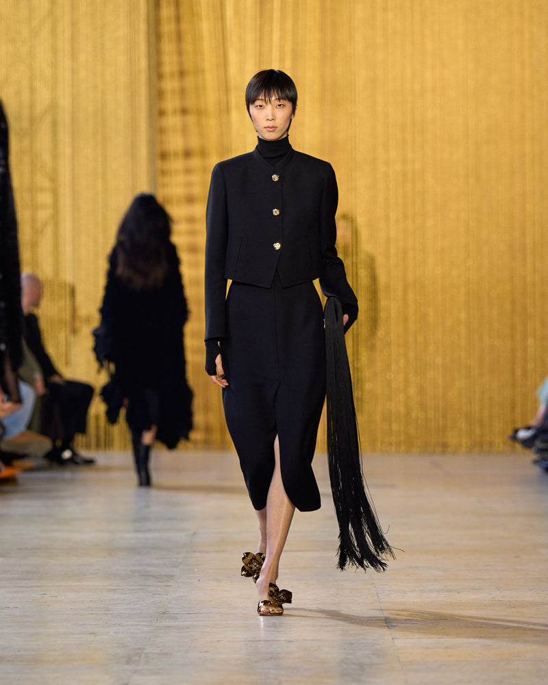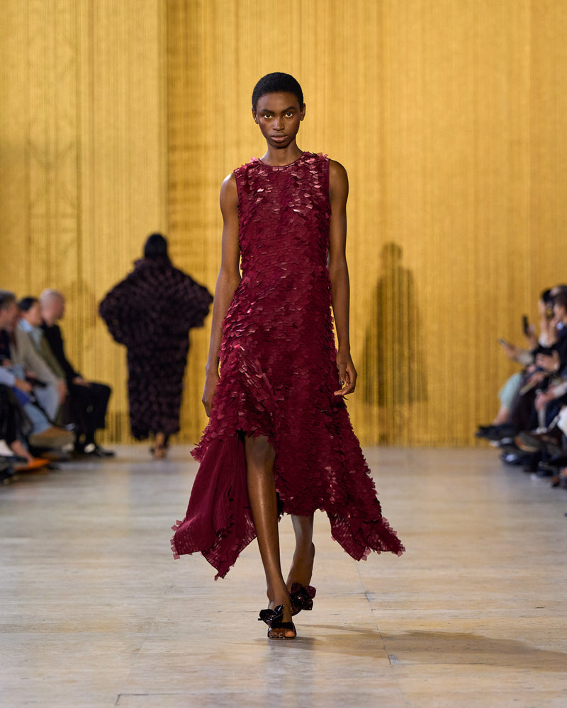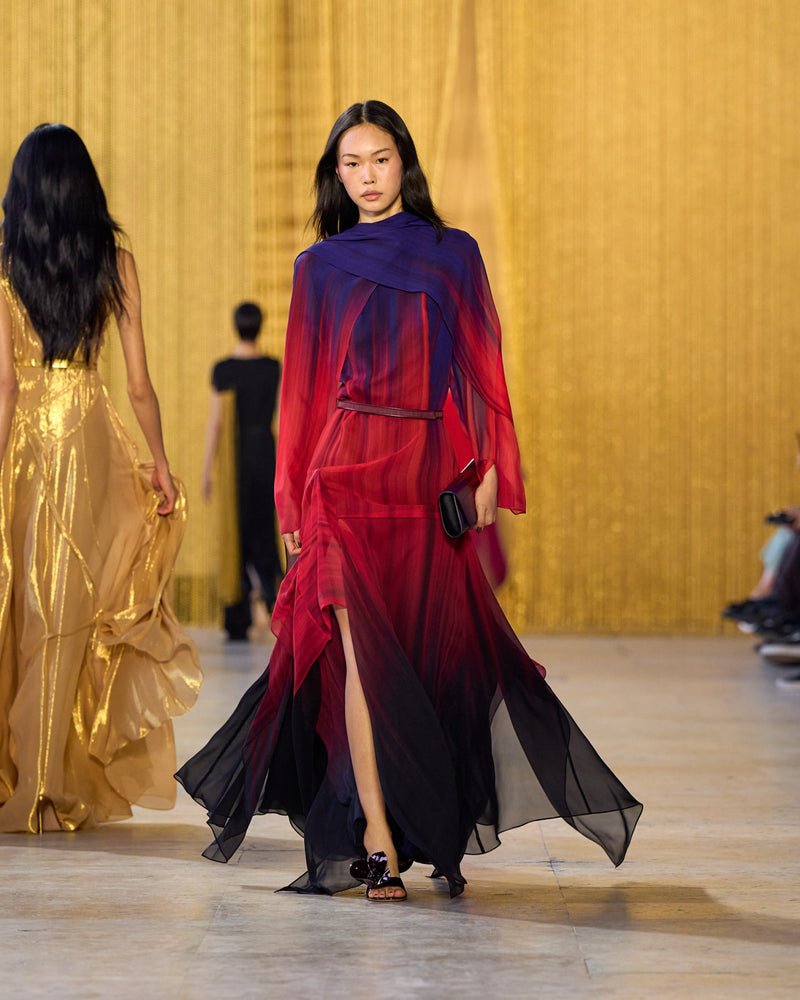 ショーはパリ「パレ・ド・トーキョー」で開催。会場内では、きらめく黄金のカーテンが空間を引き締め、モデルがランウェイにランウェイに足を踏み出すたびに微かに揺れました。
