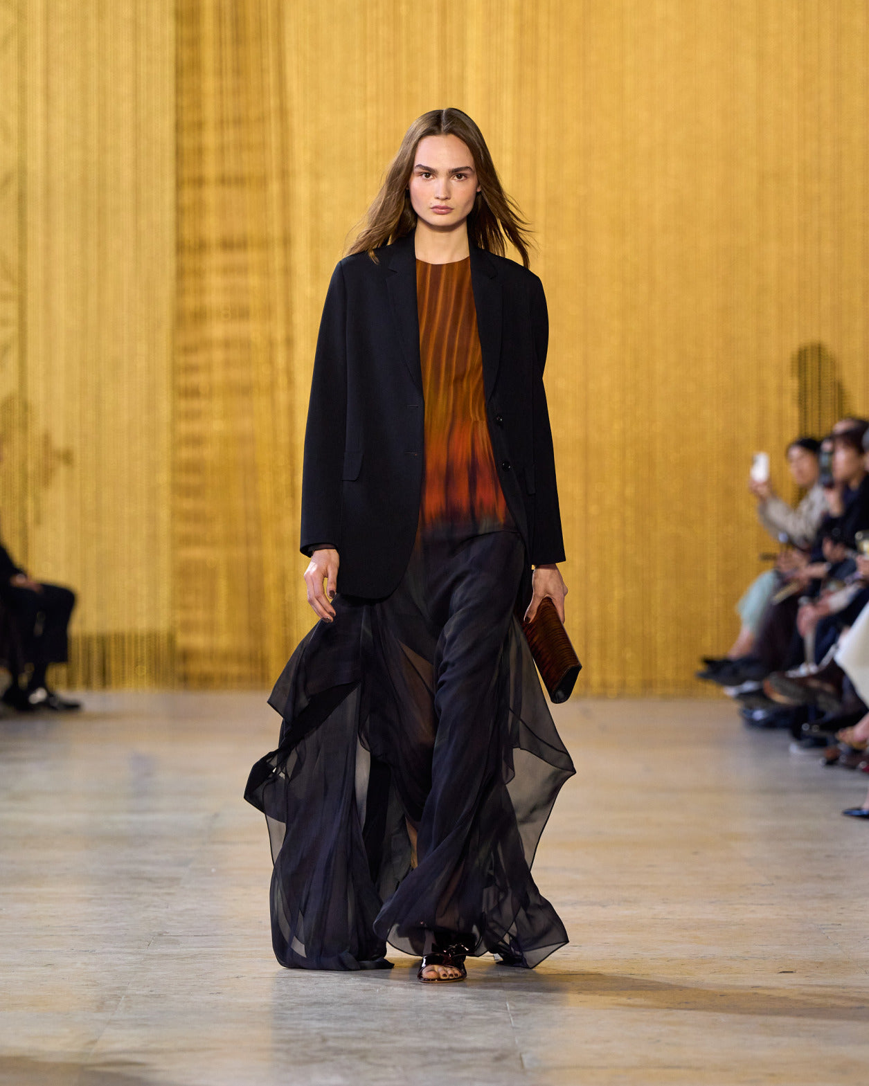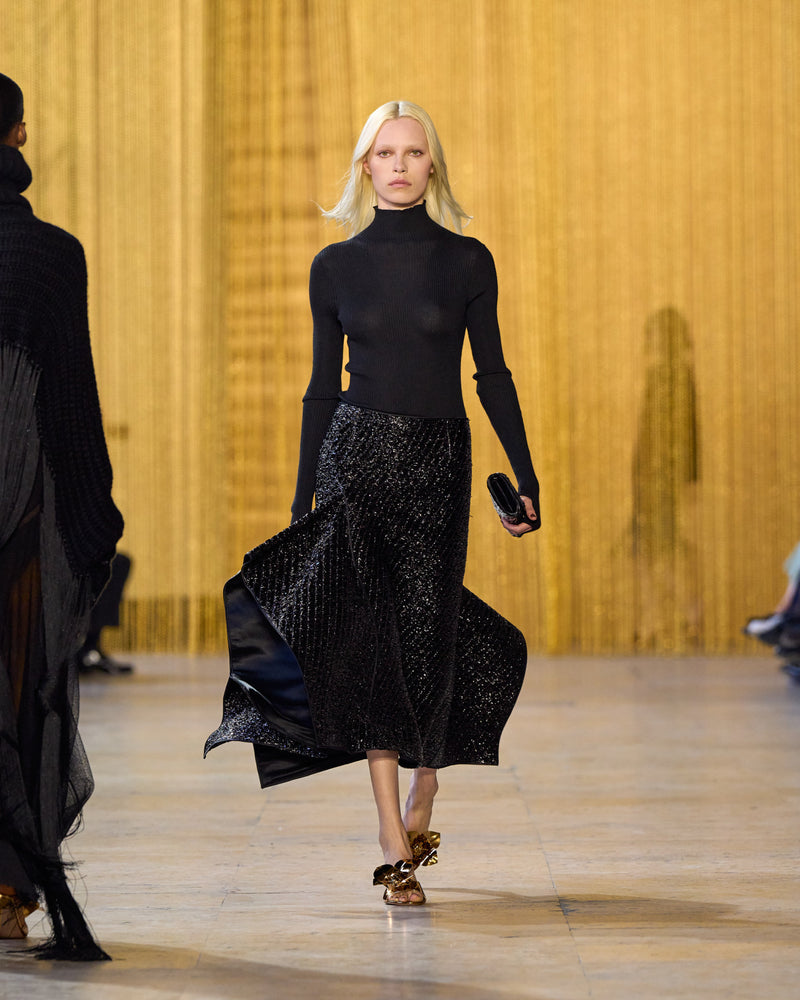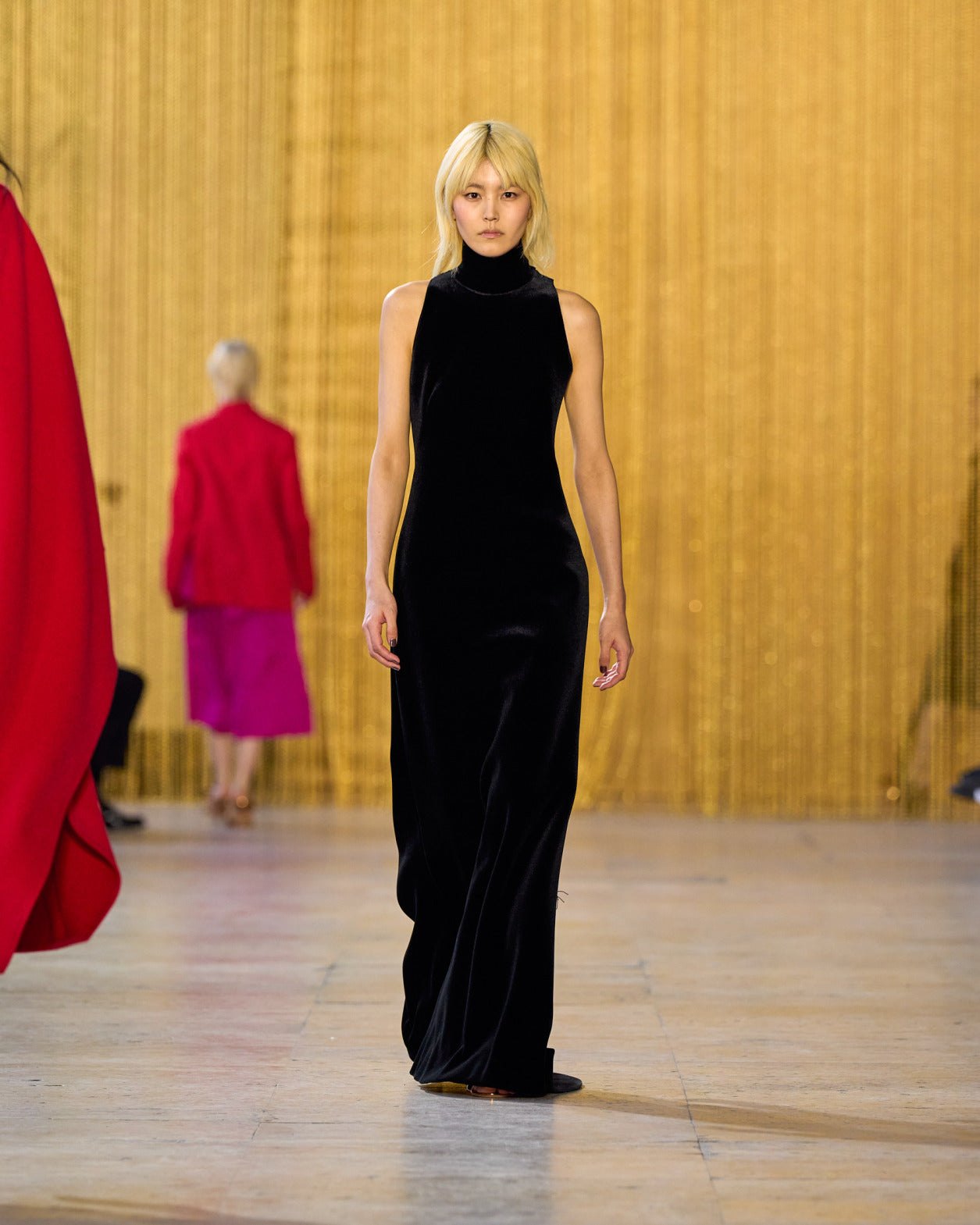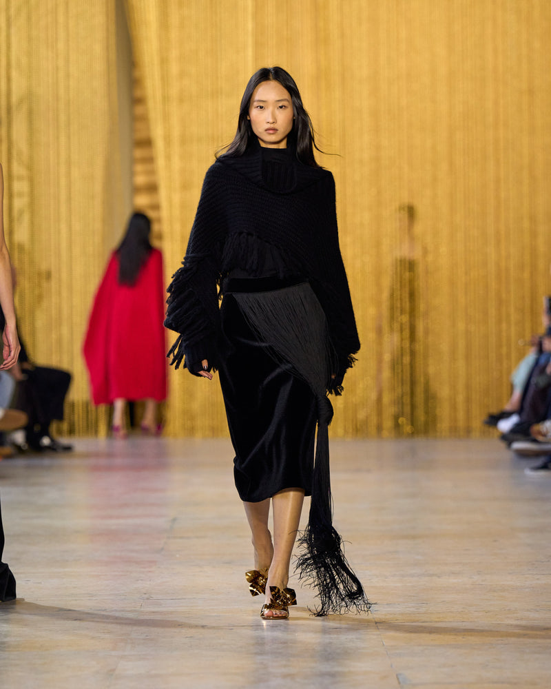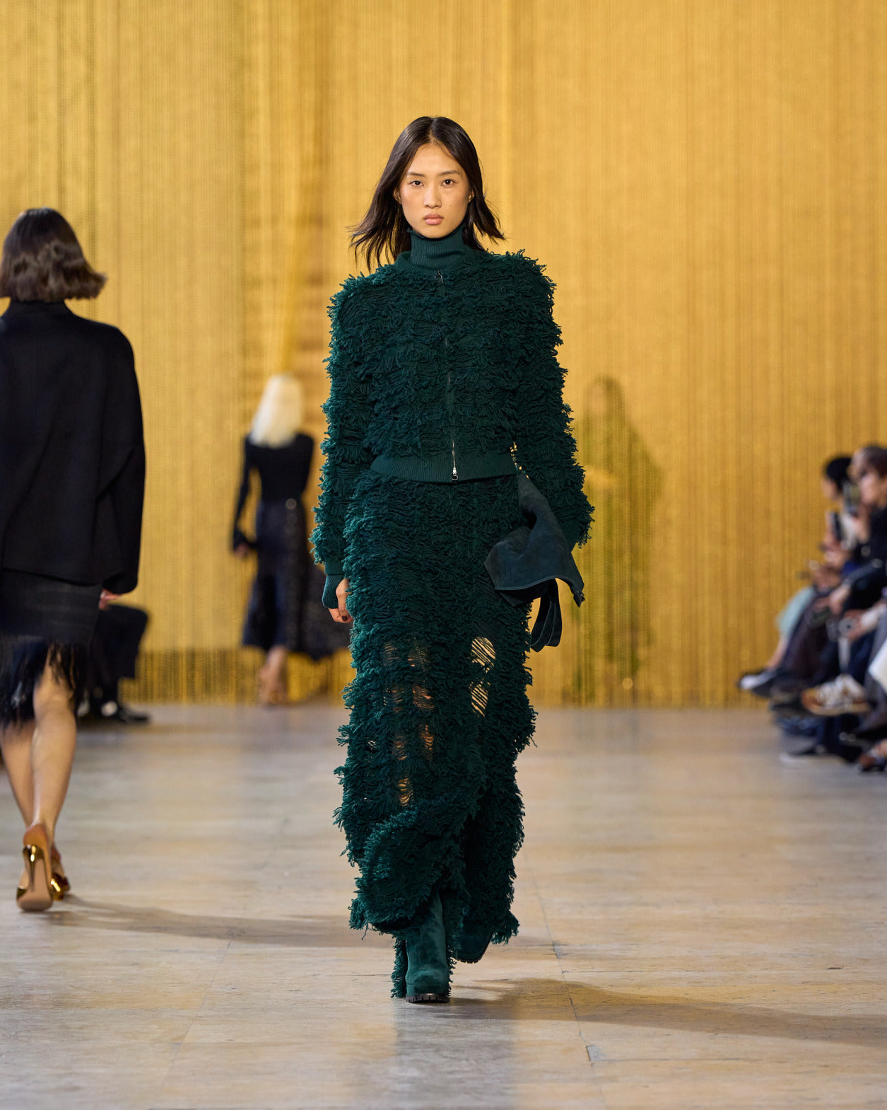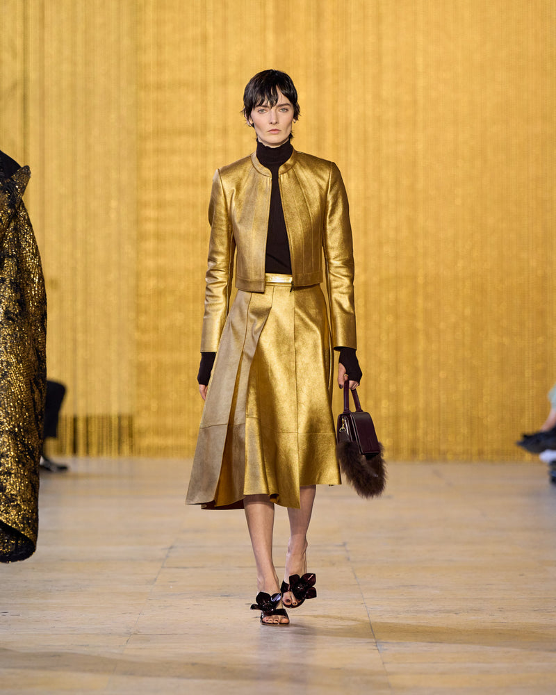 ショーはパリ「パレ・ド・トーキョー」で開催。会場内では、きらめく黄金のカーテンが空間を引き締め、モデルがランウェイにランウェイに足を踏み出すたびに微かに揺れました。