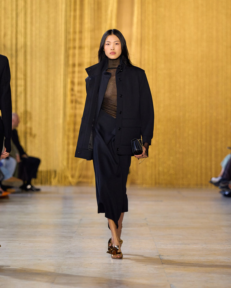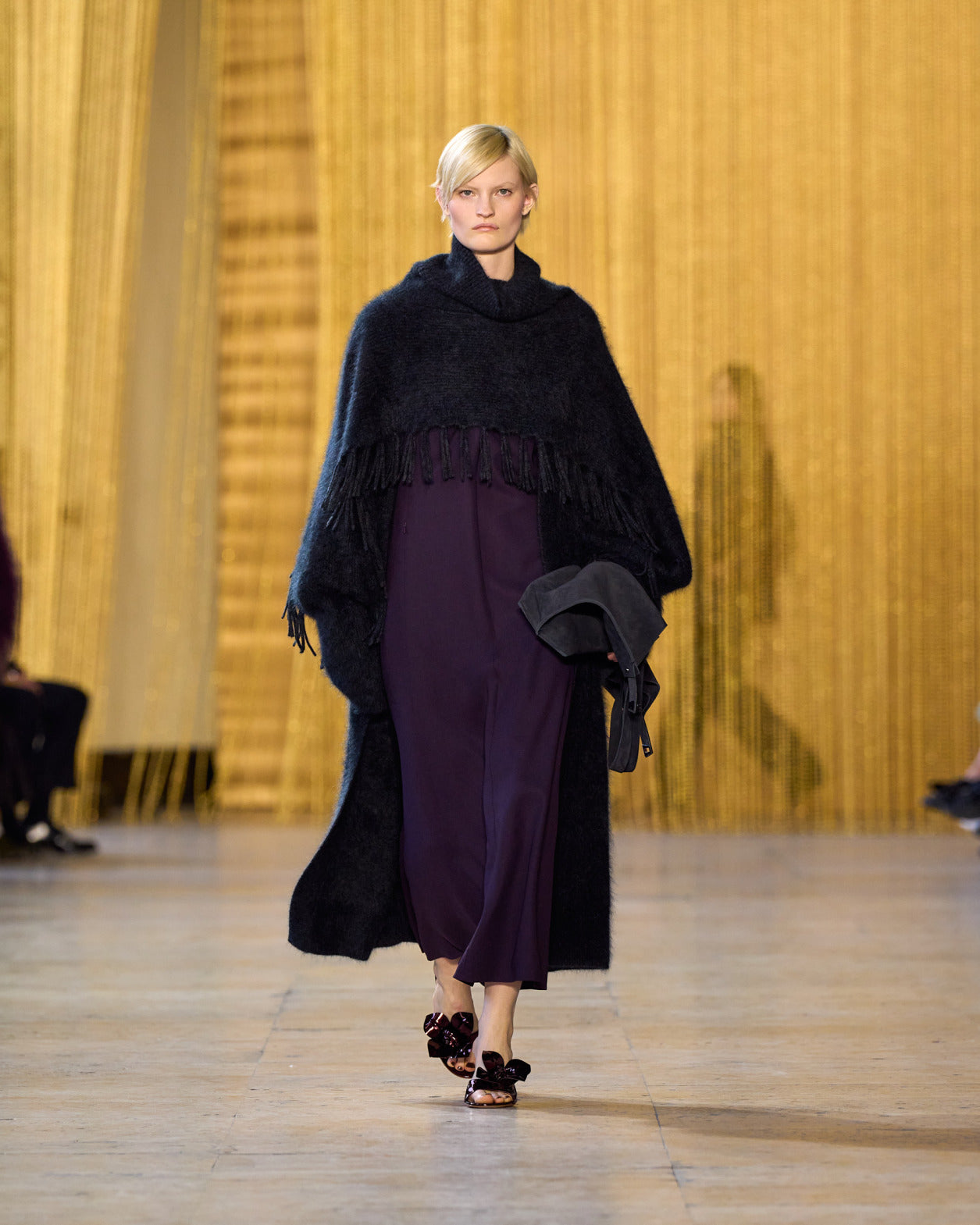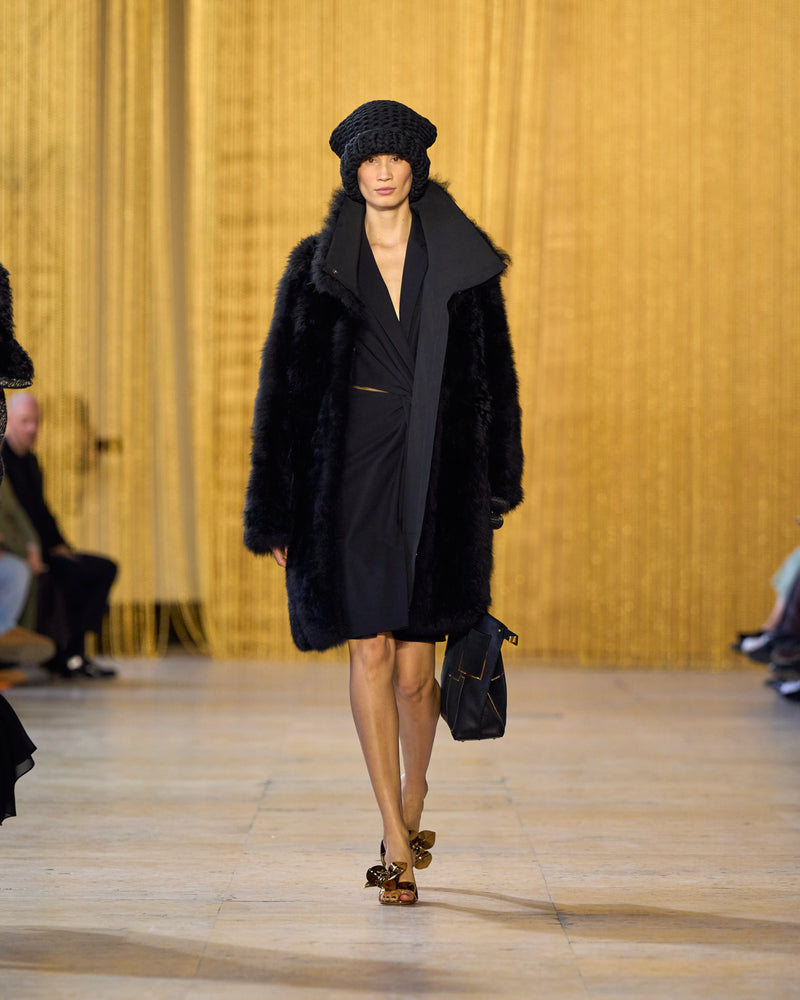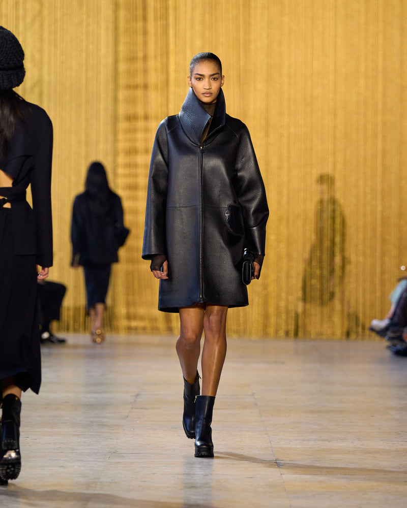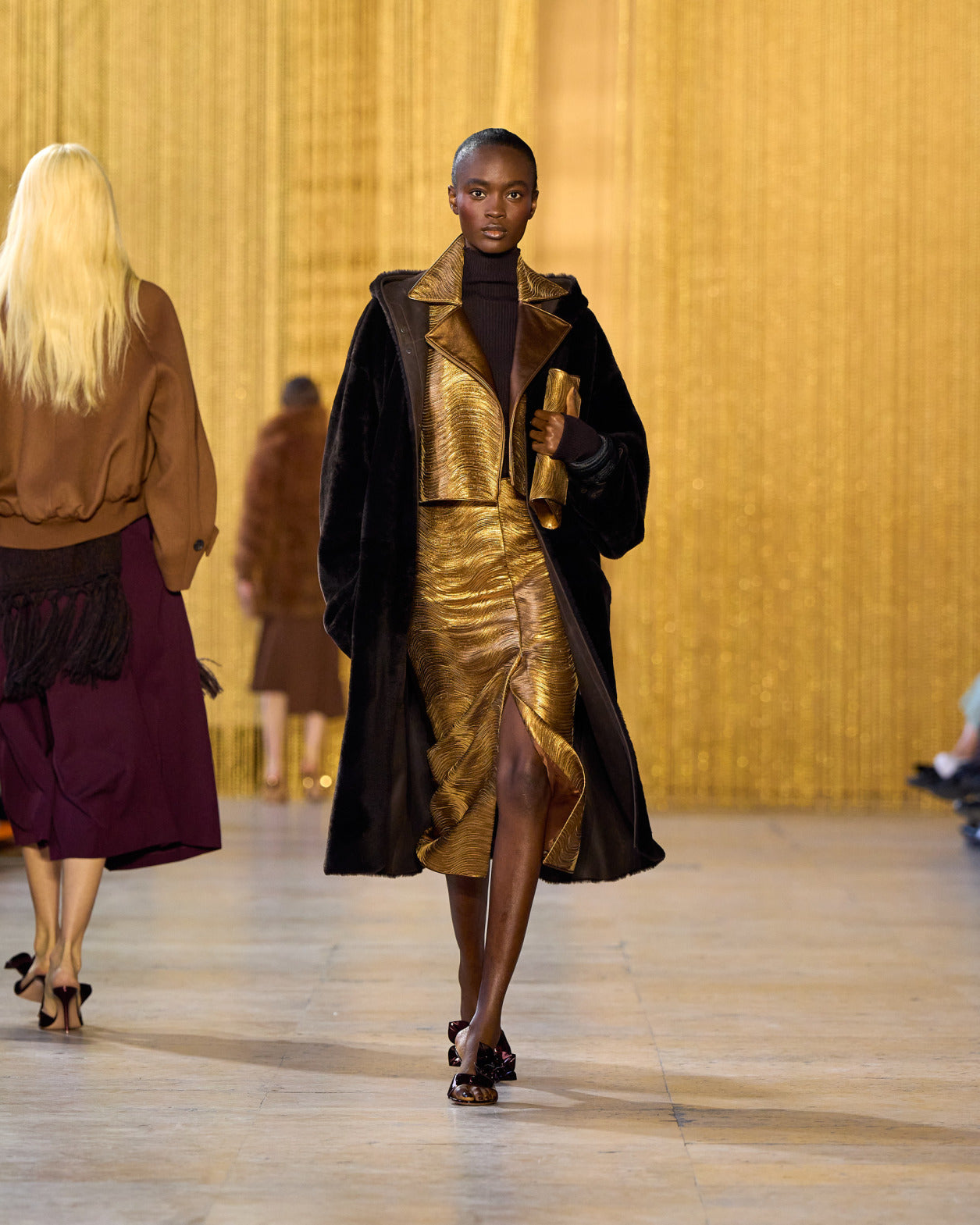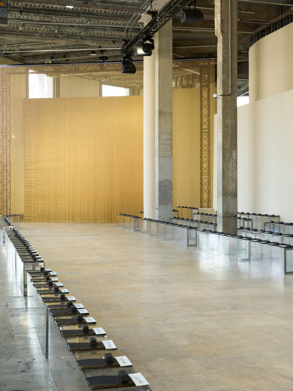 ショーはパリ「パレ・ド・トーキョー」で開催。会場内では、きらめく黄金のカーテンが空間を引き締め、モデルがランウェイにランウェイに足を踏み出すたびに微かに揺れました。