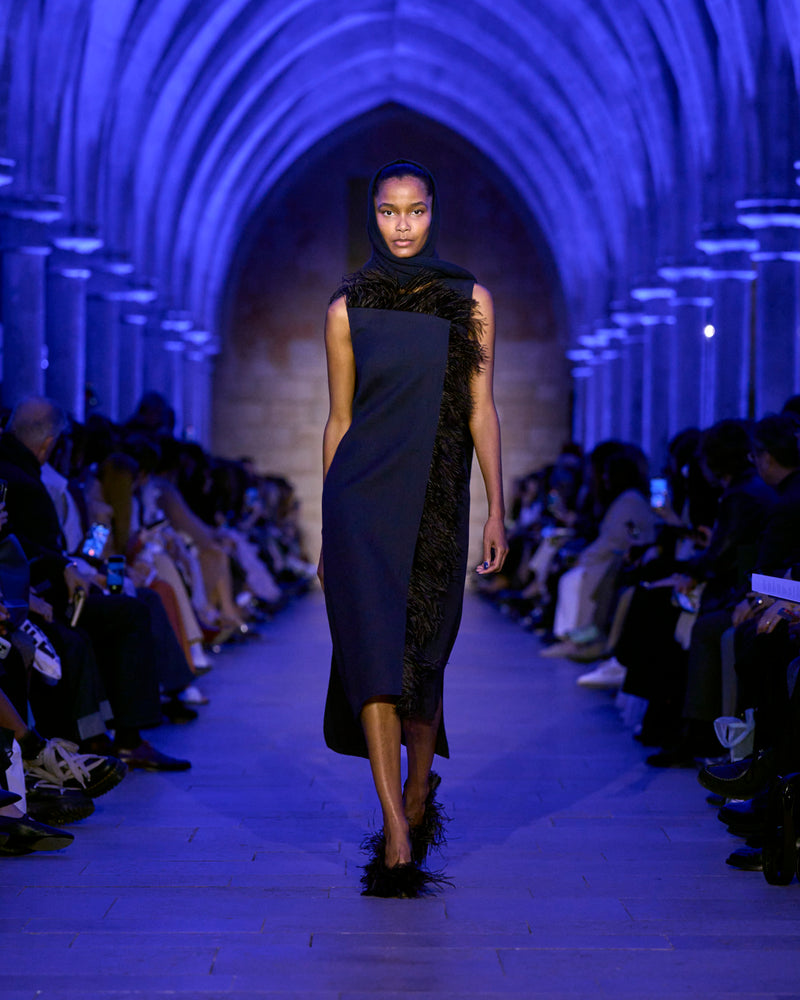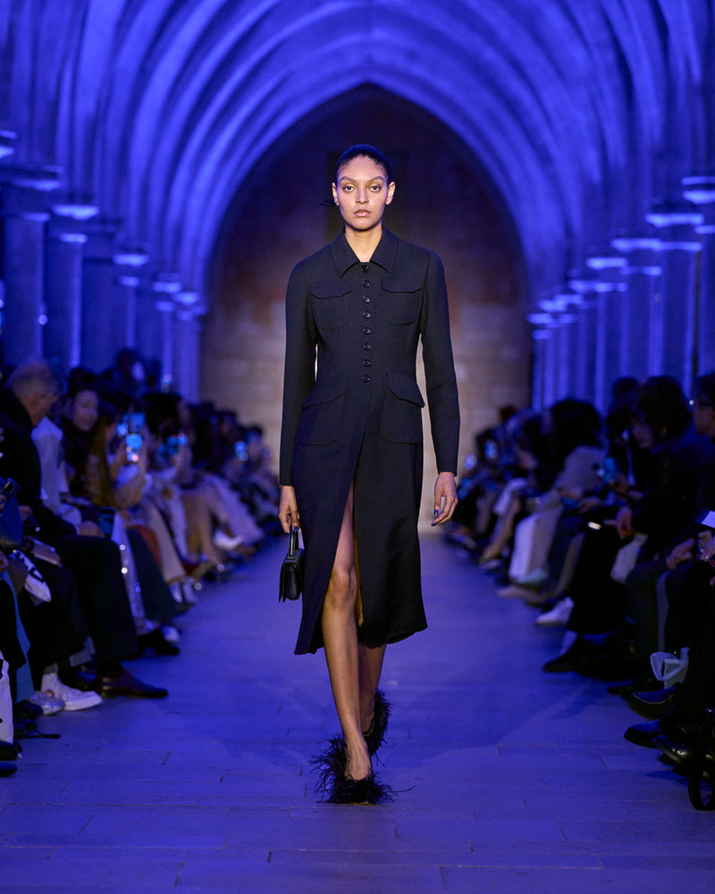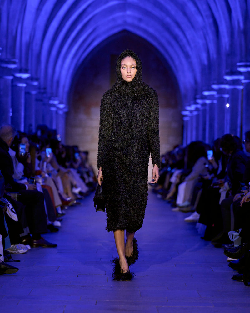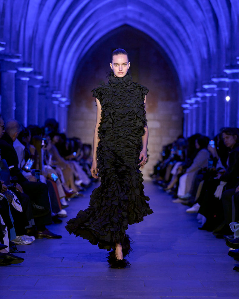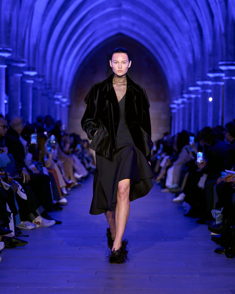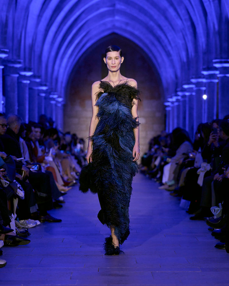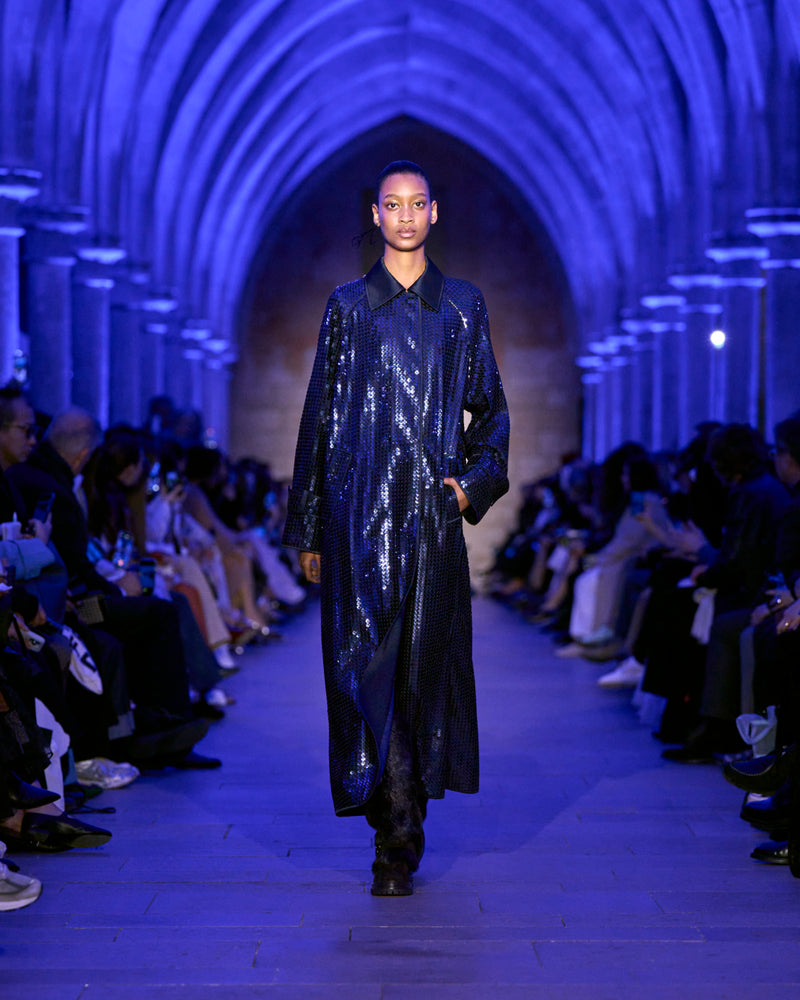 スパンコールで再構築されたオーバーコート、フェザーのついたボタンアップジャケット、オットマンシルクのショート丈トレンチコート「デュオ・コート」など。ここでは、生地はただの素材ではなく、妥協しない女性のためへのメッセージとして存在するのです。