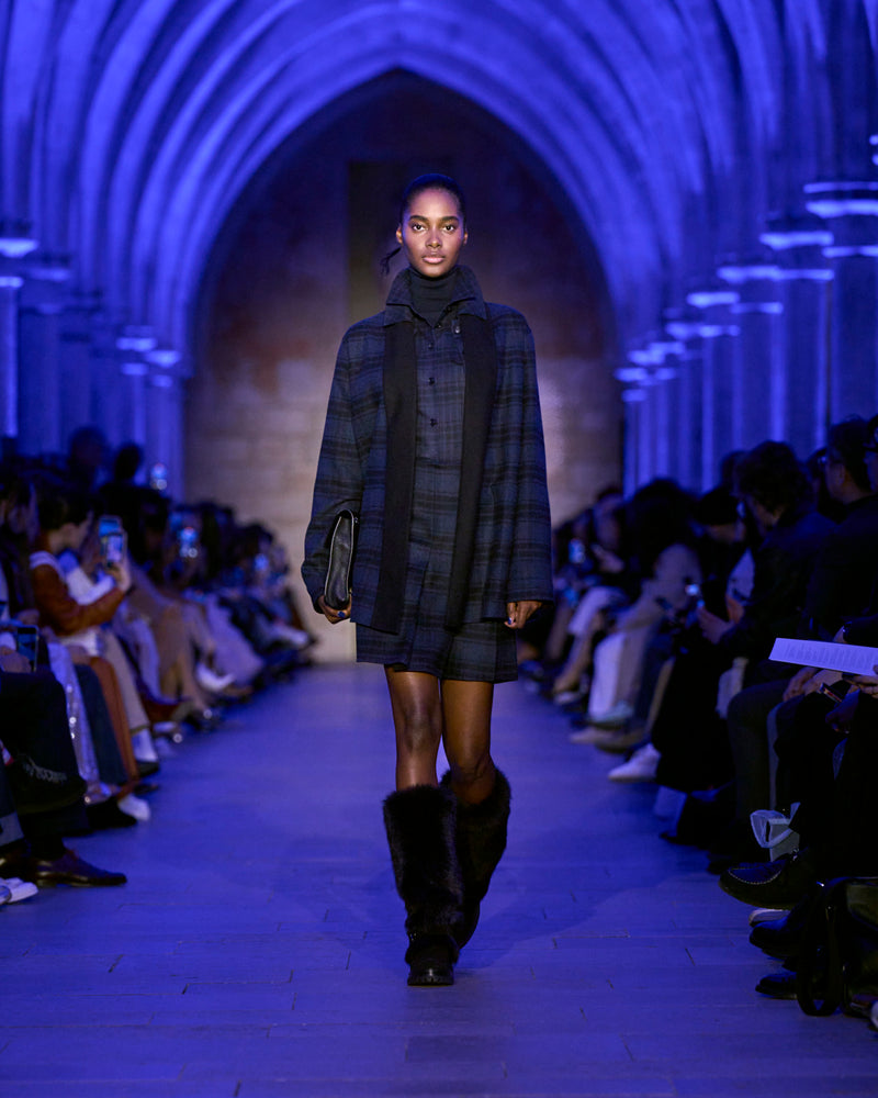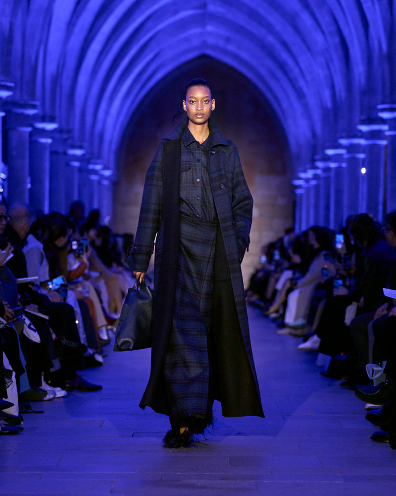 夕暮れの静けさと優しさを抱き、テクスチャーは次第に溶け合っていきます。シアリングのように見える、編み込まれたウールのフーディや、ブラッシュドカシミアのケープ、そして、まるで毛布のような、ウールダブルフェイスのチェック柄など。